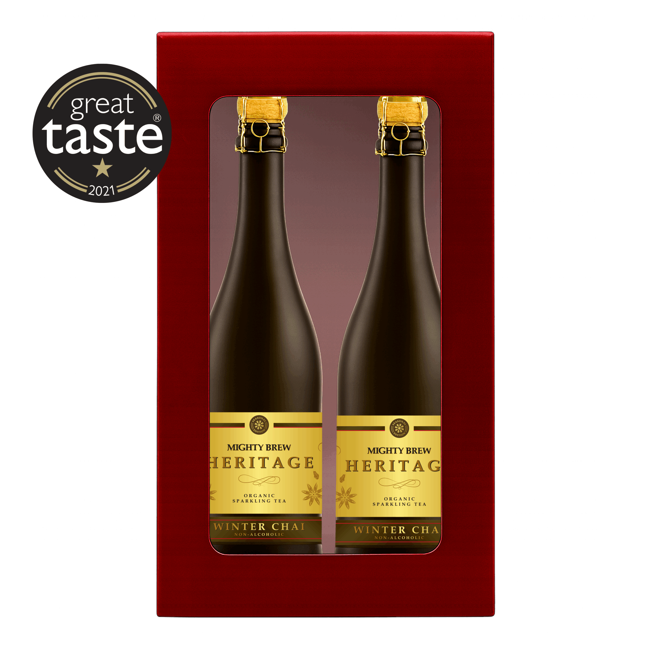 Celebrate winter with Heritage Winter Chai, our gently spiced, non-alcoholic sparkling tea, beautifully matured to enhance its Champagne-like character. Crafted with organic Assam and Pu-Erh teas and infused with warming notes of ginger, cinnamon, cardamom, and clove, this elegant brew captures the comforting spirit of the season in every sip.